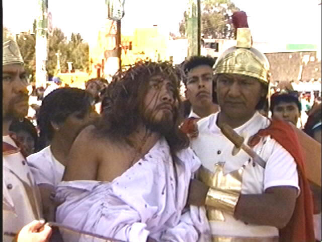 First he is taken to trial in the main plaza. This is where he will be whipped and sent to crucifixion. But it is when the trial is over that the real martyrdom begins. By this time of day, the sun is directly overhead, and fatigue begins to take hold of the actor. The procession is one of the most difficult moments of the celebration.
